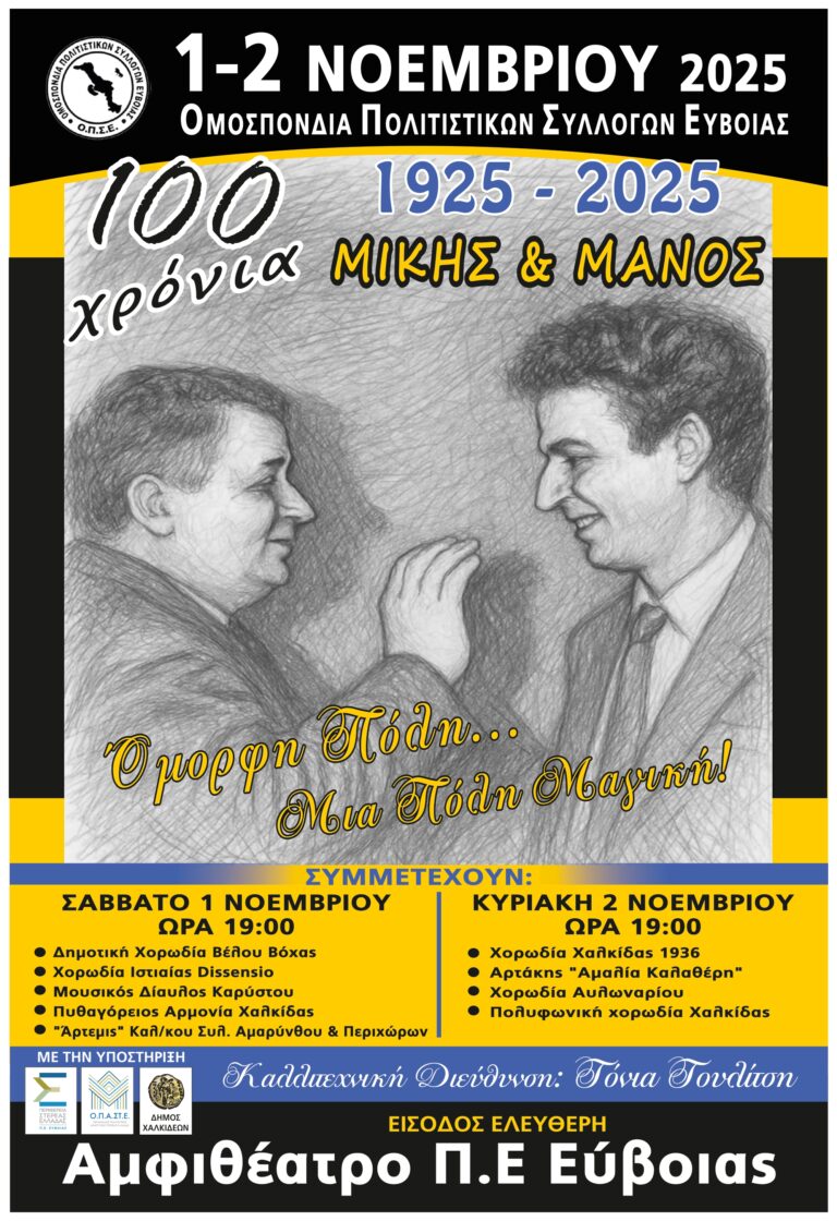 Η Ομοσπονδία Πολιτιστικών Συλλόγων Ευβοίας διοργανώνει το Σάββατο 01 & την Κυριακή 02 Νοεμβρίου, διήμερο Χορωδιακό Φεστιβάλ, στο Αμφιθέατρο της