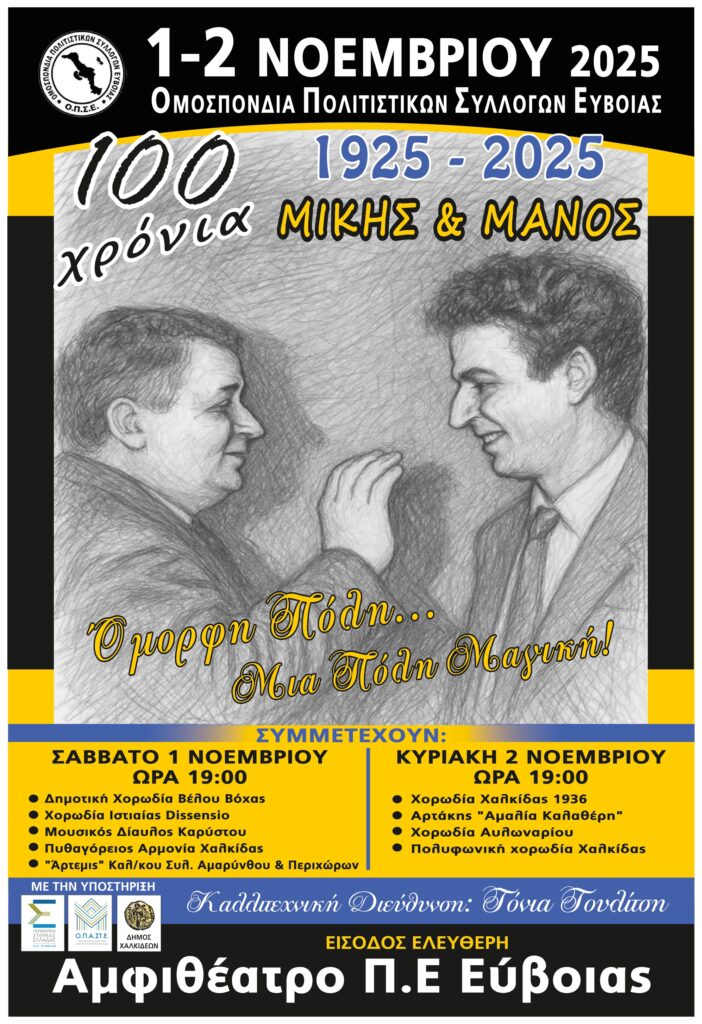 Η Ομοσπονδία Πολιτιστικών Συλλόγων Ευβοίας διοργανώνει το Σάββατο 01 & την Κυριακή 02 Νοεμβρίου, διήμερο Χορωδιακό Φεστιβάλ, στο Αμφιθέατρο της Π.Ε. Ευβοίας και ώρα 19:00.Το Φεστιβάλ είναι αφιερωμένο στα 100 χρόνια από την γέννηση των Μίκη Θεοδωράκη και Μάνο Χατζιδάκι με τίτλο “Όμορφη πόλη…Μια πόλη μαγική”.Διοργάνωση Εκδήλωσης: Ο.Π.Σ.Ε.Καλλιτεχνική Διεύθυνση: Τόνια ΤουλίτσηΜε την Υποστήριξη: Περιφέρεια Στ.Ελλάδας […]